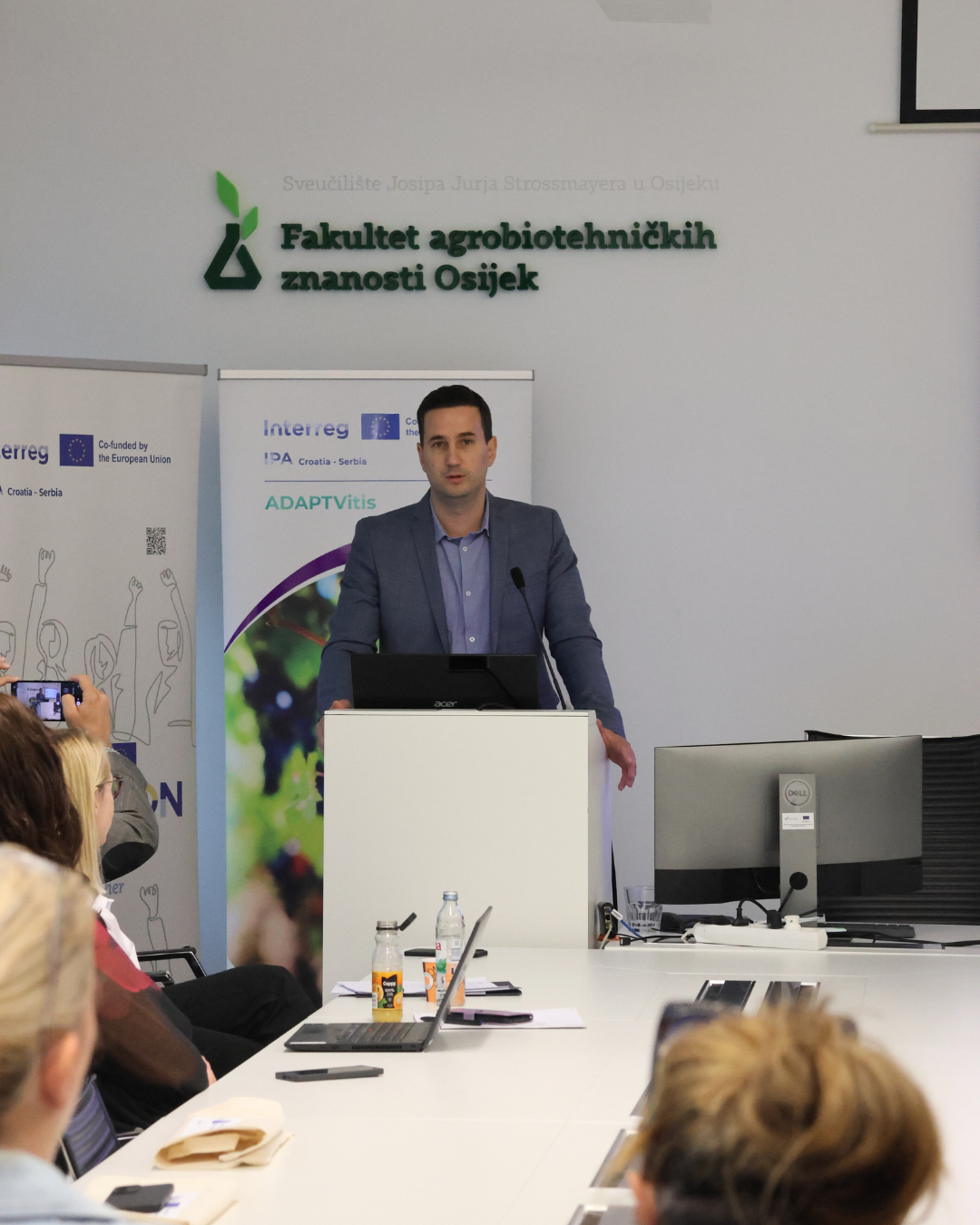 Following that, Toni Kujundžić, Vice Dean for Experimental Field Development and Technology Transfer at the Faculty and project manager of ADAPTvitis, presented the strategic ADAPTvitis project. The initiative aims to develop new technologies for climate-resilient viticulture, helping wine production adapt to the challenges of climate change.